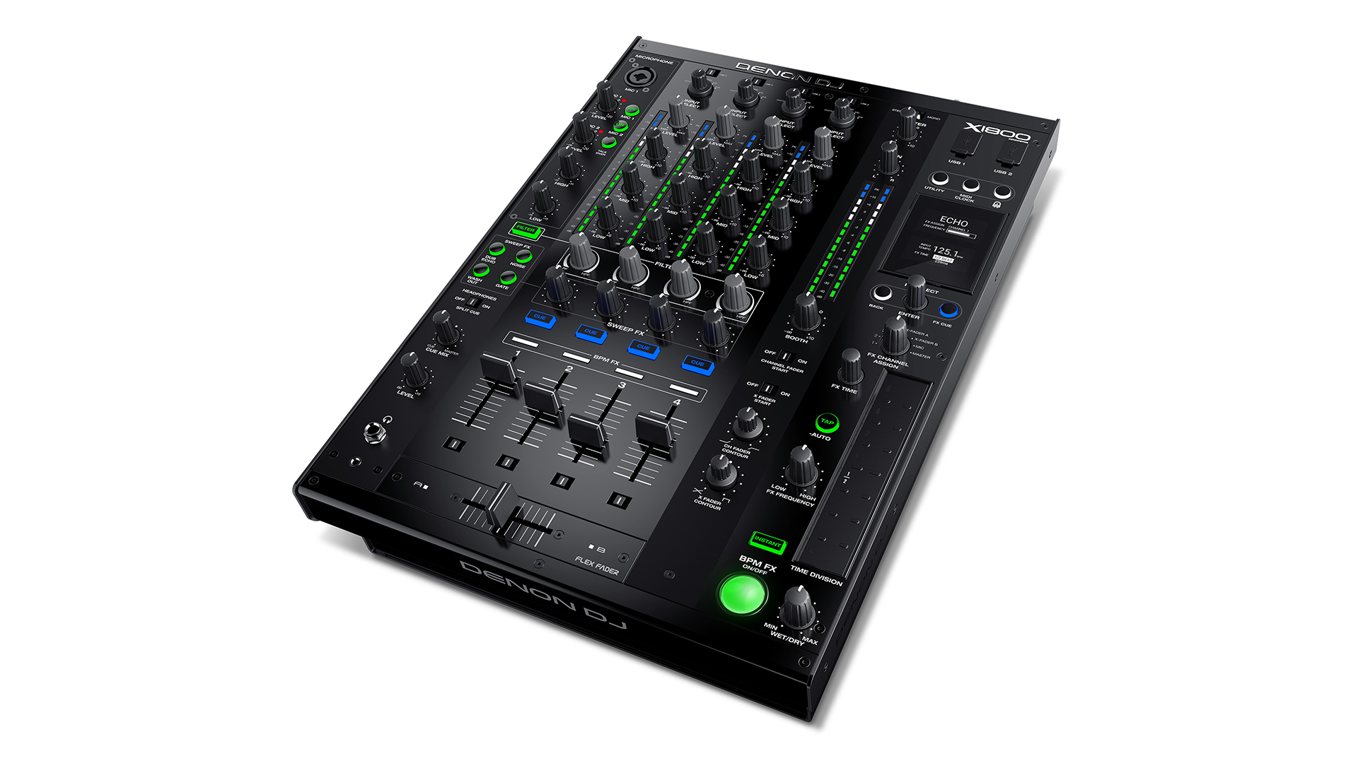 The effects unit has all the usual options, including echo, delay, ping-pong, flanger, phaser, reverb, and more. Selection and configuration are shown on the LCD display. All the effects are beat-synced, with selectable duration from 1/16 of a beat to 8 beats. The BPM information can be manually set, or is auto-set from data sent from SC5000 media players when used with the X1800.